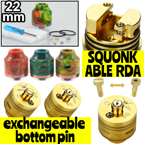 The deck is built for a single coil only, making this a go-to for simple builds of 3mm or less. With a smaller deck, your builds may need to be smaller than normal, but the Wasp Nano makes up for this with it's amazing flavor. The adjustable 510 connection pin is removable and comes with a replaceable squonk pin for those who like the ease of a bottom feeding RDA. It also contains a pretty deep juice well for it's size (roughly 5mm) for less dripping throughout the day.
